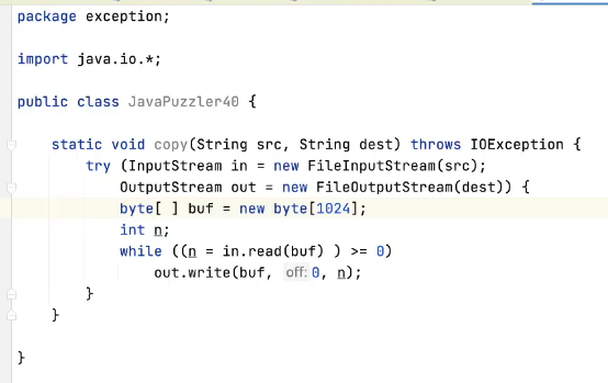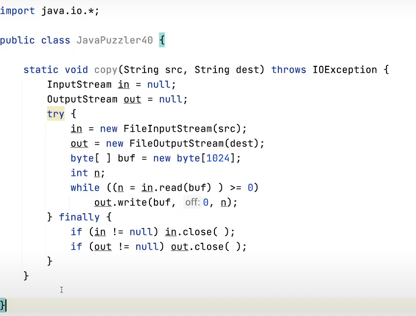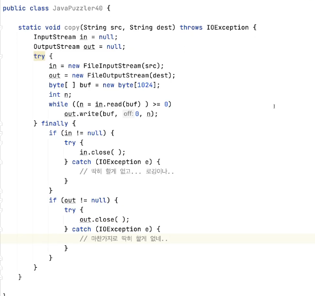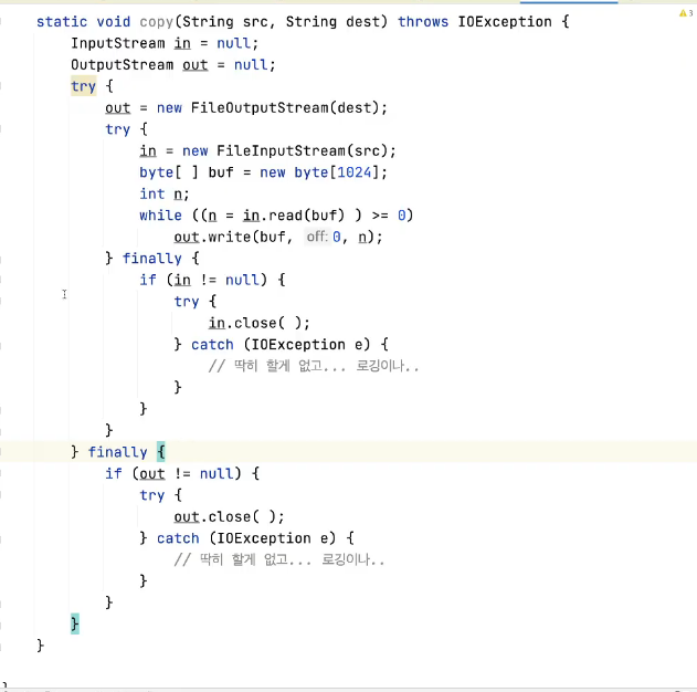 ๊ฐ์ 1) try๋ธ๋ก์์ in.close()์ ์์ธ ์ค IOException์ด ์๋ RuntimeException์ด ๋ฐ์ํ๋ฉด ๋ ๋ ๋ฒ์งธ try๋ธ๋ก์ out.close()์ ๋๋ฌํ์ง ๋ชปํ ์ ๋ ์๋ค.