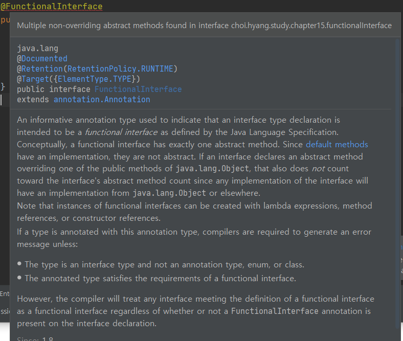 @FunctionalInterface 애노테이션을 붙이면 컴파일 시점에 checking 한다.